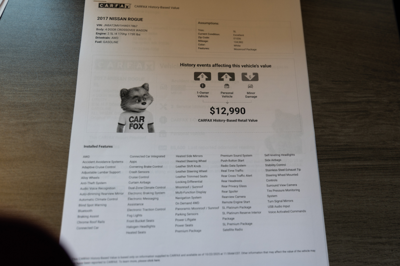 Step into this sleek and stylish 2017 Nissan Rogue and get ready to embark on all your adventures with ease. This reliable vehicle will keep you and your loved ones safe with its array of safety features, ensuring peace of mind every time you hit the road. The Carfax report available for this car guarantees transparency and trust in your purchase. Equipped with modern amenities such as keyless entry and cruise control, this Rogue offers a comfortable and convenient driving experience. The alloy wheels and rear spoiler add a touch of sportiness to the exterior, while the cargo area tiedowns provide practicality for all your gear. Whether you're cruising down the highway or navigating city streets, the Rogue's exceptional handling and stability control will keep you in control at all times. Don't miss out on this opportunity to own a fantastic vehicle that seamlessly combines safety, style, and versatility in one package. Call 413-246-5356 Shown by appointment only.